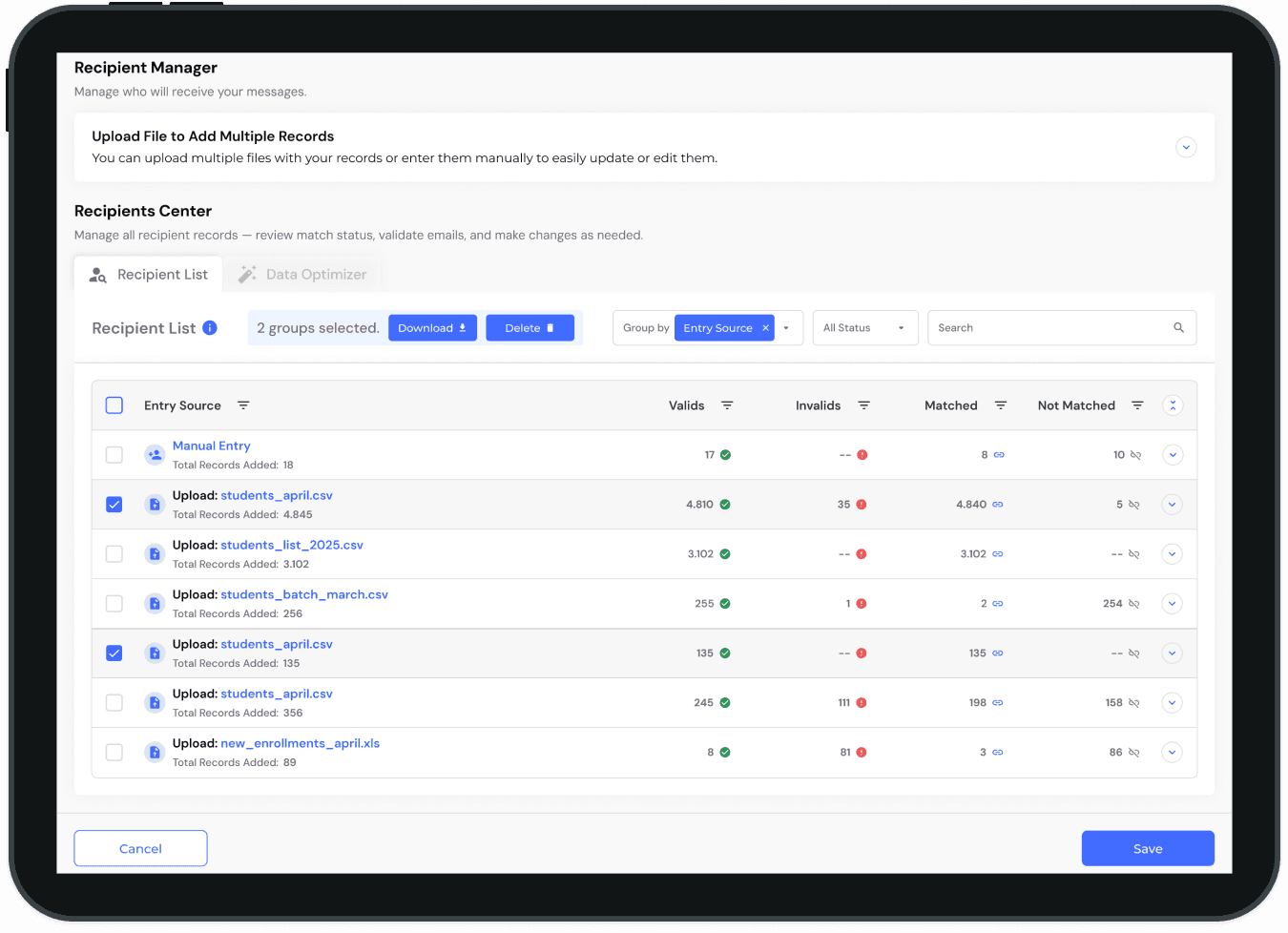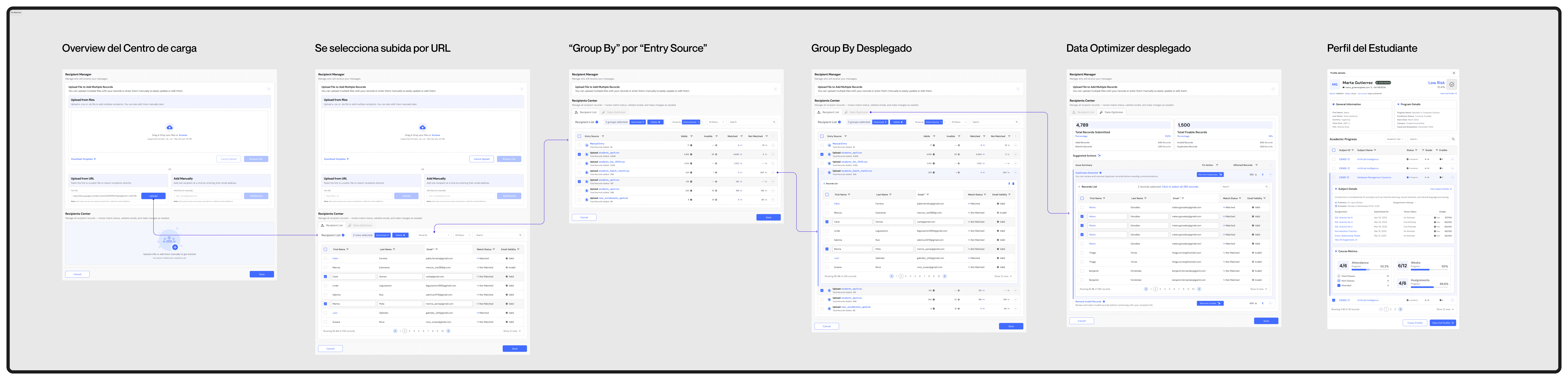 Cuando los usuarios gestionan cientos de registros provenientes de distintas fuentes (cargas manuales, múltiples archivos), una lista única puede volverse abrumadora y difícil de navegar. Para resolver este desafío, diseñé la funcionalidad "Agrupar por" (Group By).