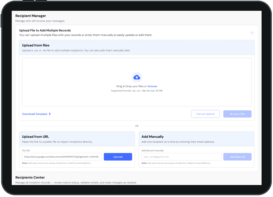 Cuando el usuario ya tiene destinatarios cargados, el acordeon se muestra en su estado colapasado para dar lugar a la sección “Recipients Center”: