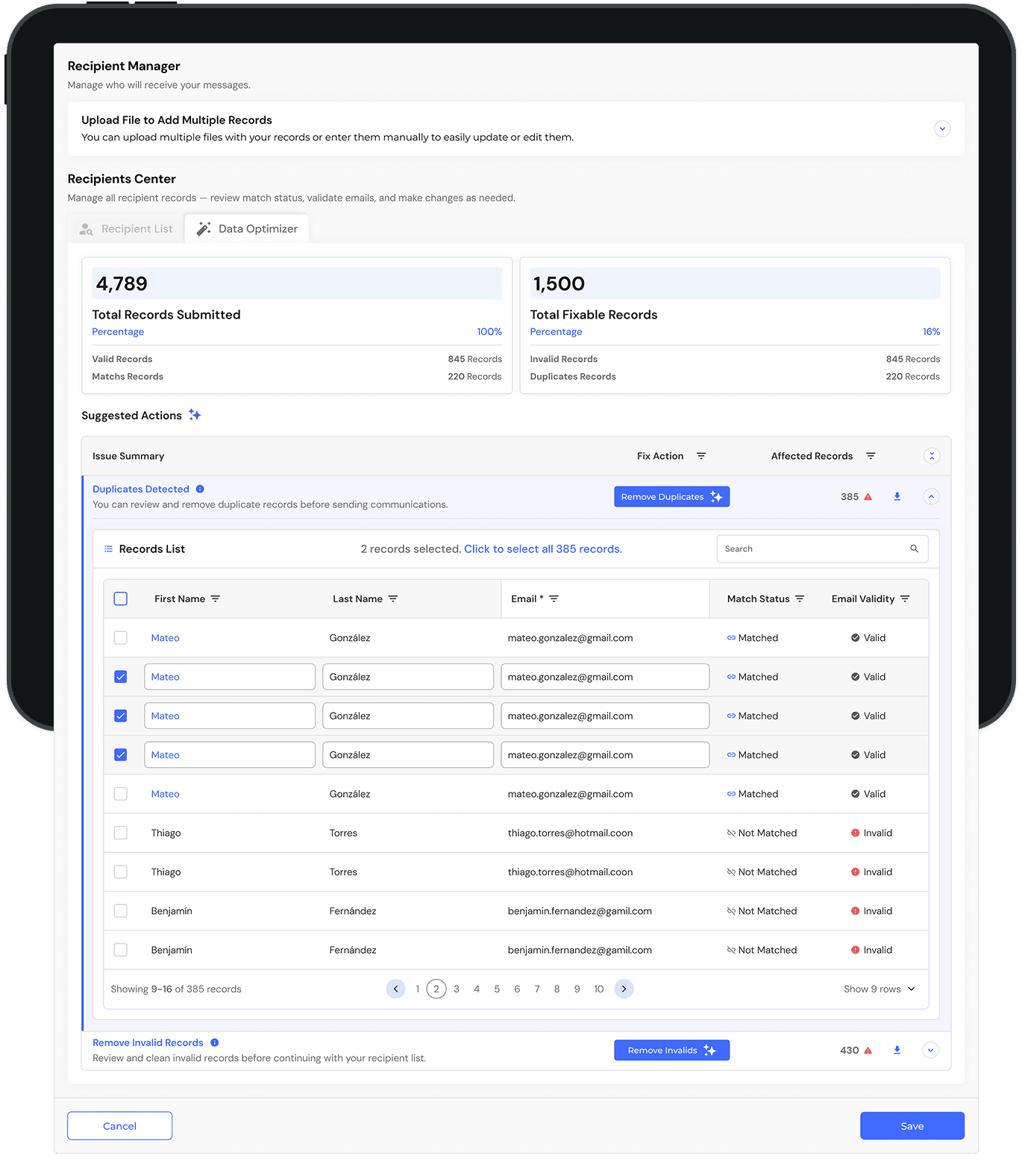 Filtros Inteligentes: Permiten al usuario aislar rápidamente los registros con problemas (ej. "Email inválido" o "No encontrado") sin tener que revisar manualmente listas interminables.