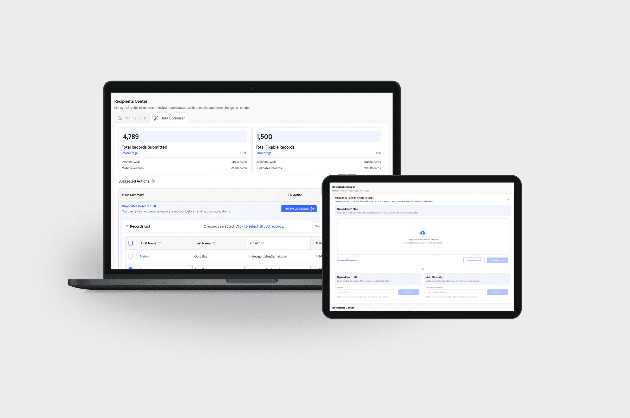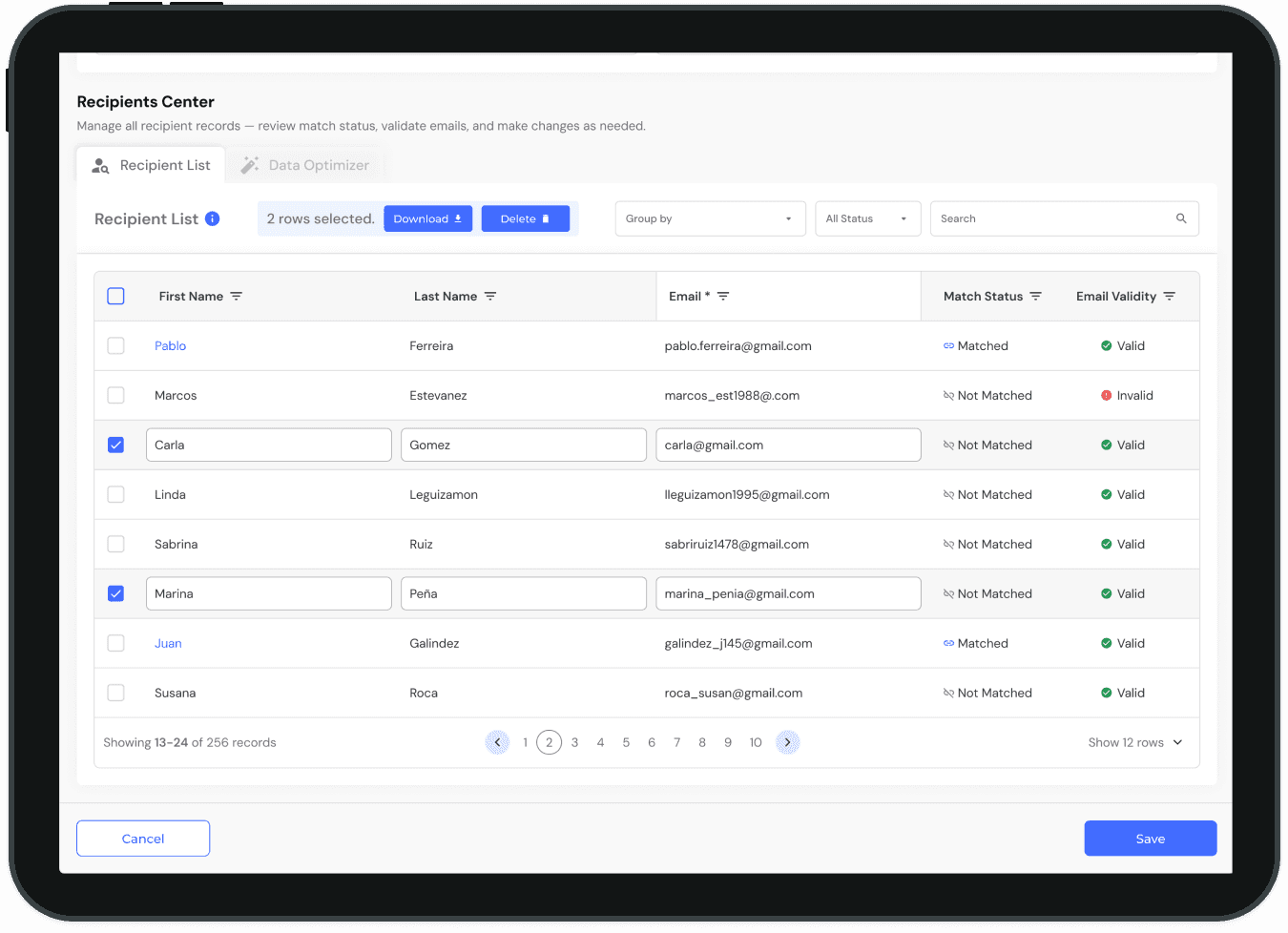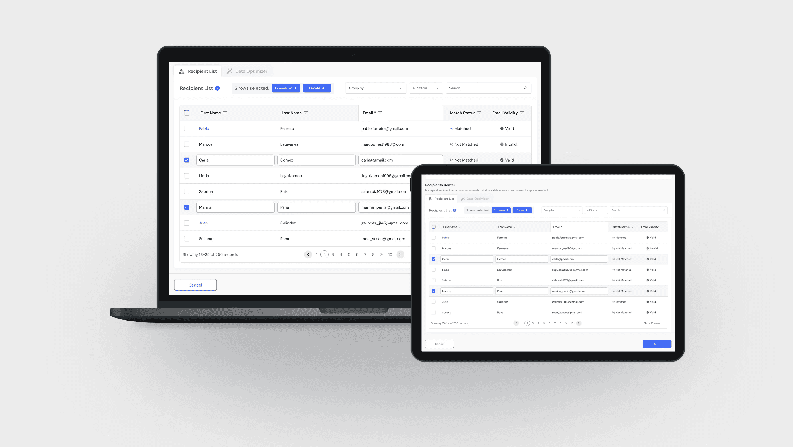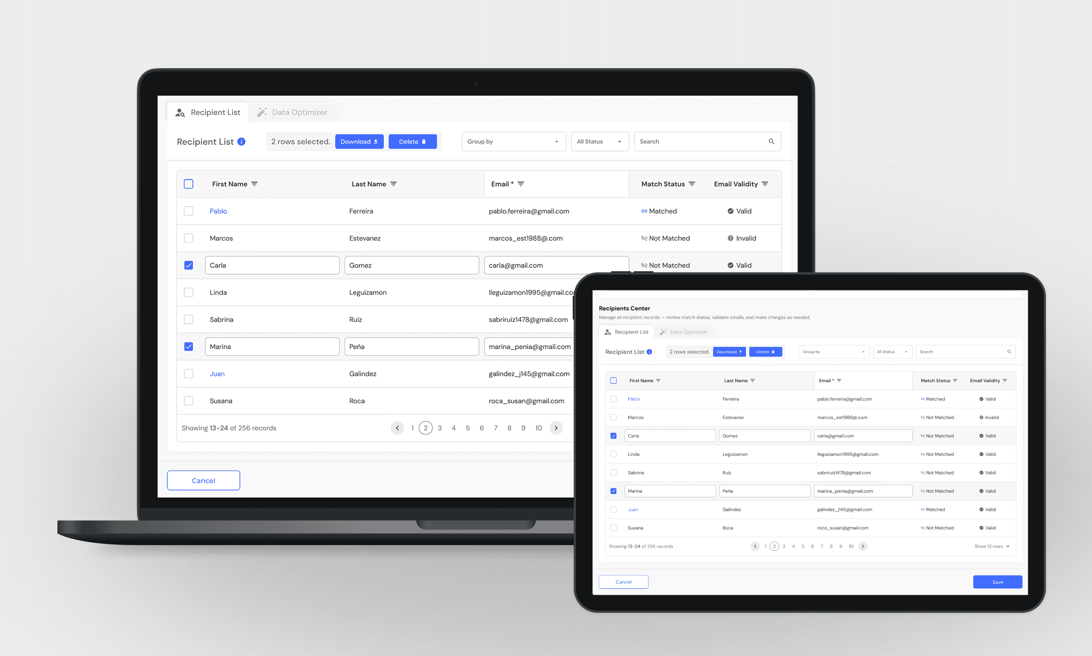 Acciones en Lote: Una vez que los datos están limpios, el usuario puede seleccionar múltiples registros para descargarlos o eliminarlos de forma masiva, agilizando la gestión de la lista.